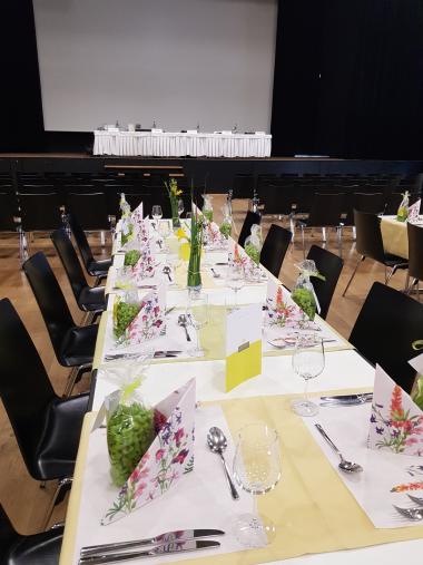 Bei unerwartet schönem Wetter trafen sich 95 Teilnehmende im liebevoll dekorierten Aaresaal in Belp zur SGF-Generalversammlung 2025.